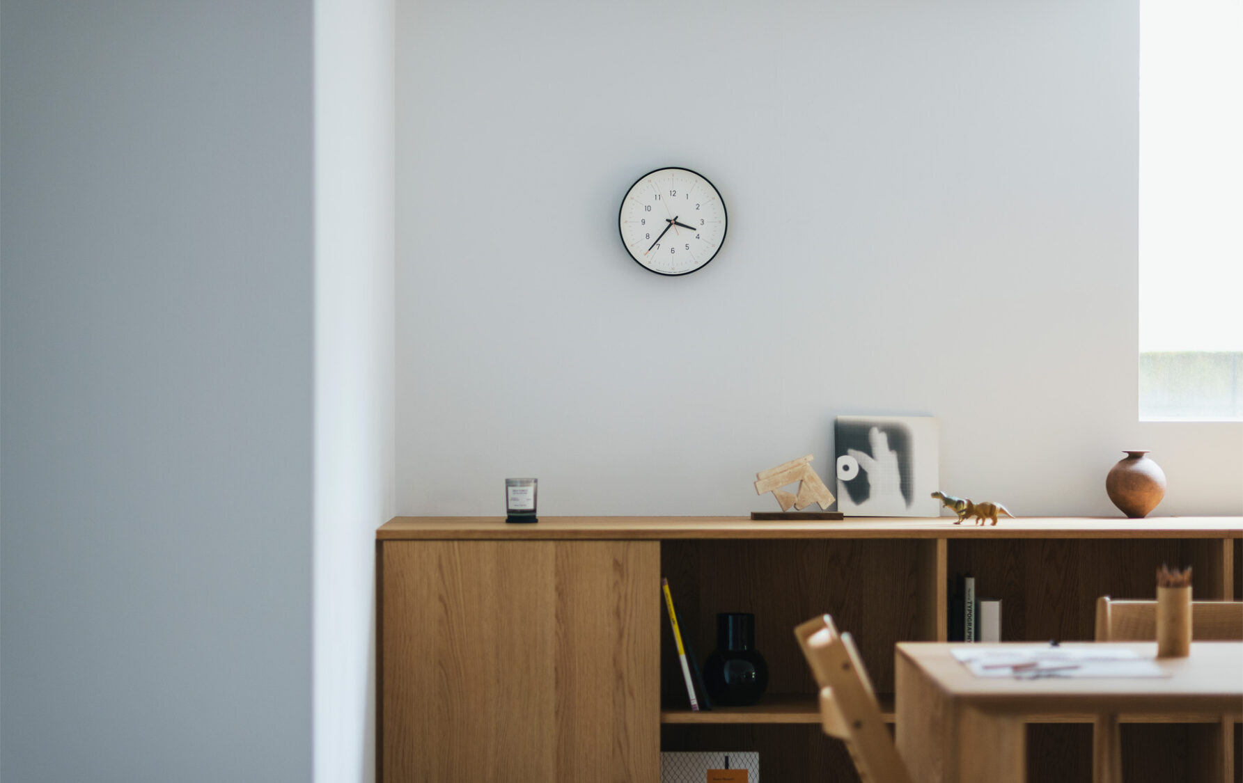 ひとつは、デザイナーである北川大輔氏自身の子育ての体験と記憶からです。彼のこどもが時計を読み始めるようになったころ、時間(12進法)と分/秒(60進法)の違い、時針/分針/ 秒針の違い、それぞれがわかり易く且つインテリアに馴染む、という掛け時計は市場になかった、と彼は言います。そこで彼は、こどもでも分かり易く、こどもだけでなく様々な空間に馴染む掛け時計を創りたいと考えました。