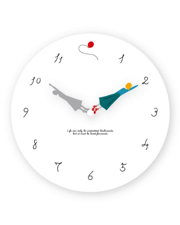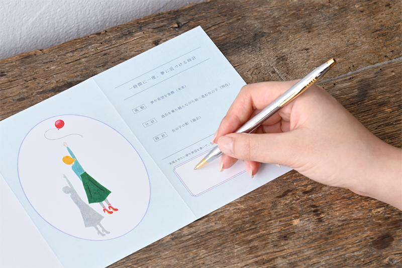 本体の12時をしめすところに「夢」を象徴するモチーフ(風船/蝶/流れ星)をあしらい、分針の女の子がモチーフのところまで進むと、それらを捕まえているように見える仕掛けとなっています。時針は女の子の「影」であり、「過去」を表し、分針は色々な「過去」を乗り越えながら前に進んでいく女の子の「現在」を表しています。