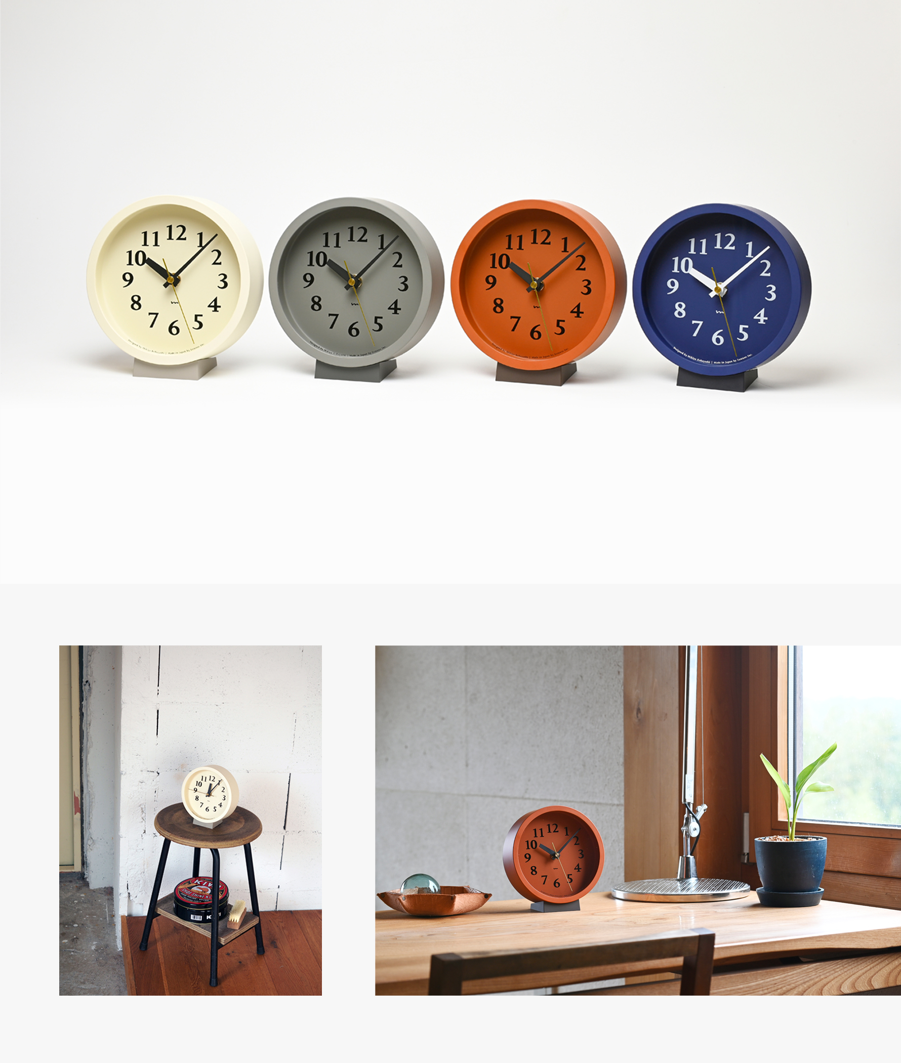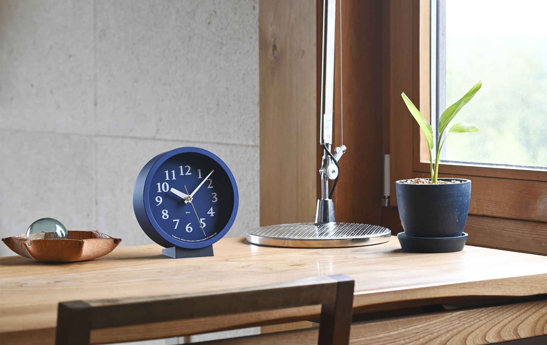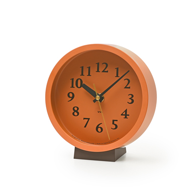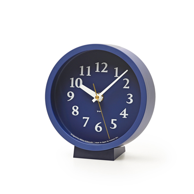 小ぶりな盤面に小気味良く数字をちりばめた置き型の電波時計です。針の長さや太さ、数字のサイズ、色の構成などを吟味し、見やすく心地よい佇まいの時計となりました。真鍮色の秒針が盤面を引き立てます。