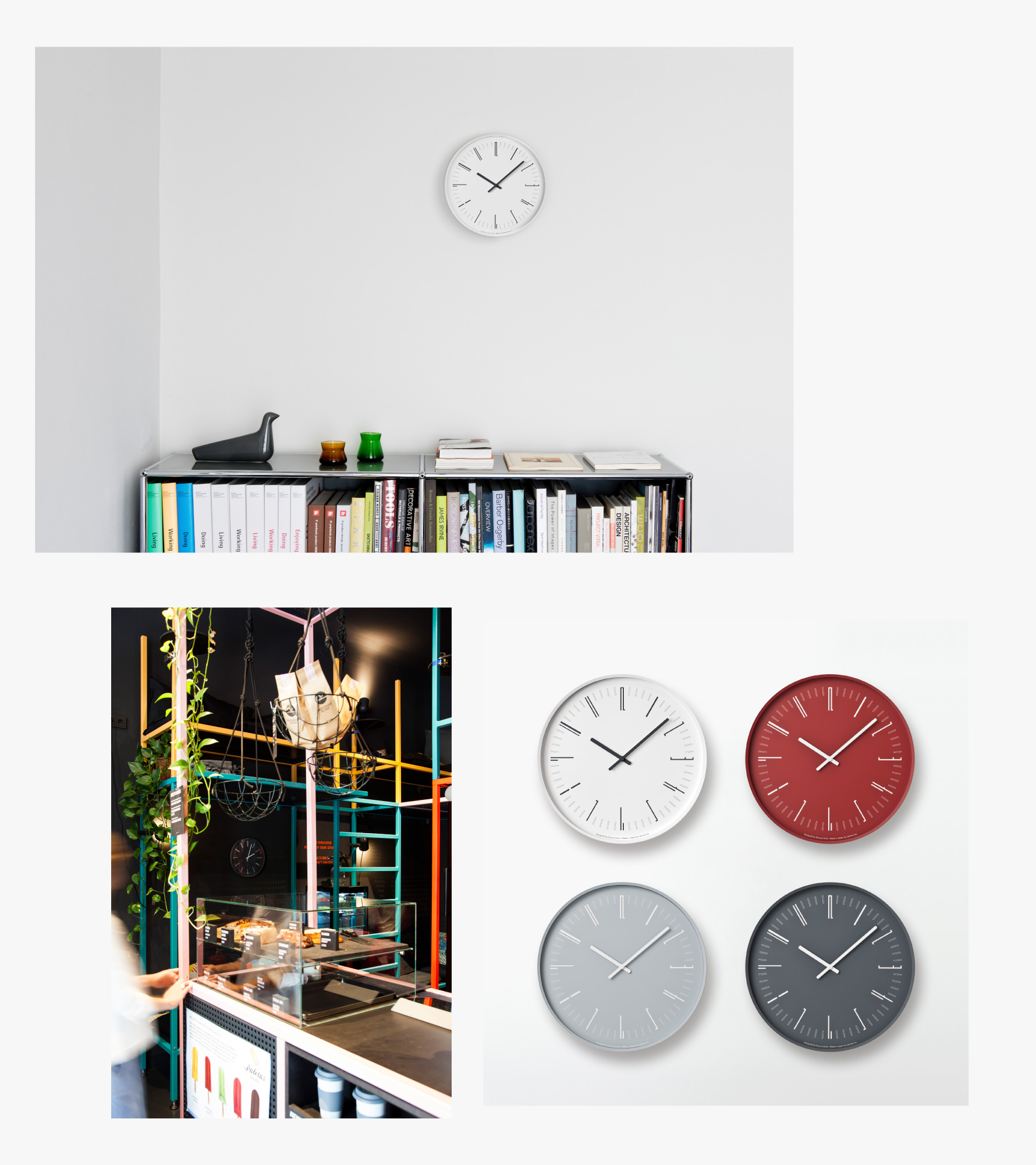 The design of this clock was attained through the process of gradually making a line resemble a number by adding and removing lines, while considering the kind of expression that this could give to a clock. The effect was accomplished by keeping the forms of the indicators to a level where they could still be recognized as numbers from the layout alone on the clock.