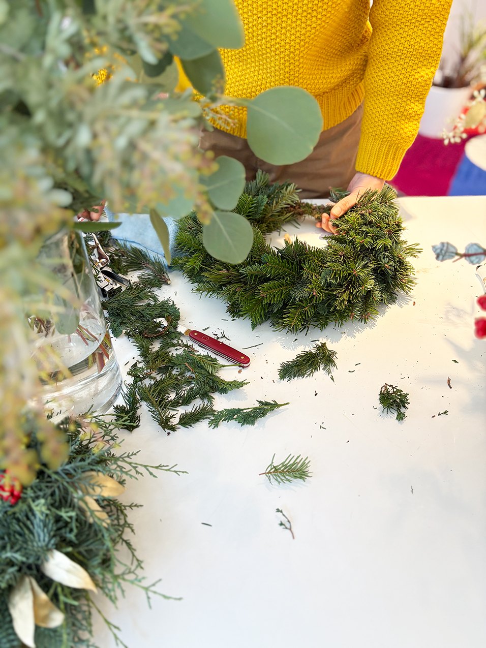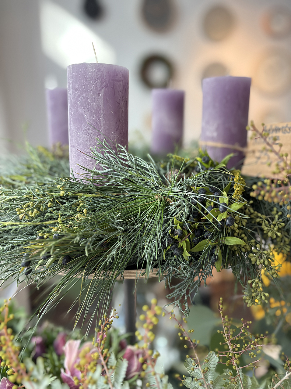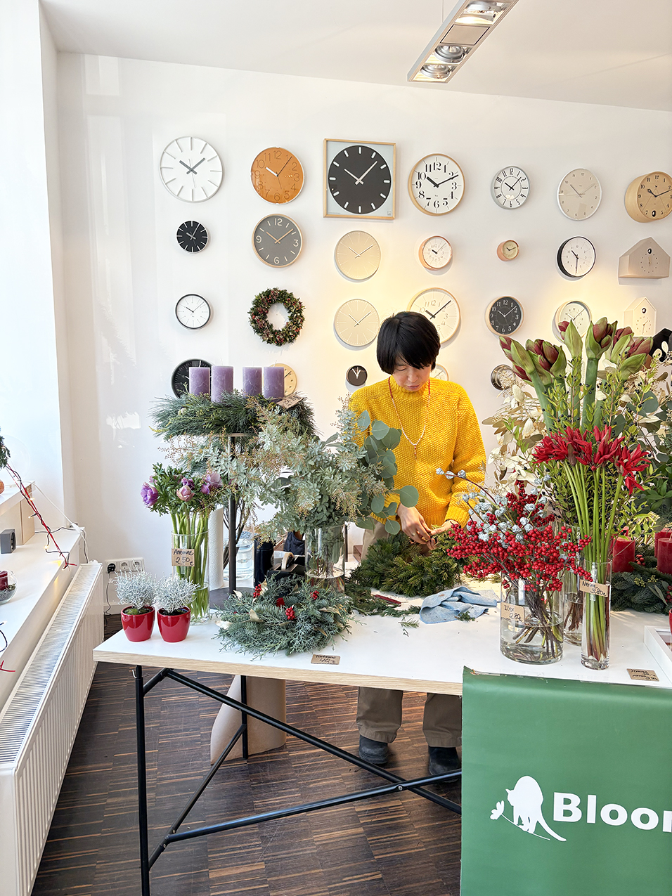 The showroom was decorated with vibrant Christmas wreaths and candles by florist Mie, welcoming many visitors.