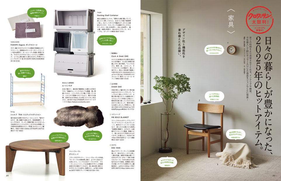 Magazine house’s publication Croissant, Issue No. 1155 (December 25, 2025), featured the wall clock “Clock A Small OAK” designed by Yota Kakuda in its “Best Buys of 2025” special section.