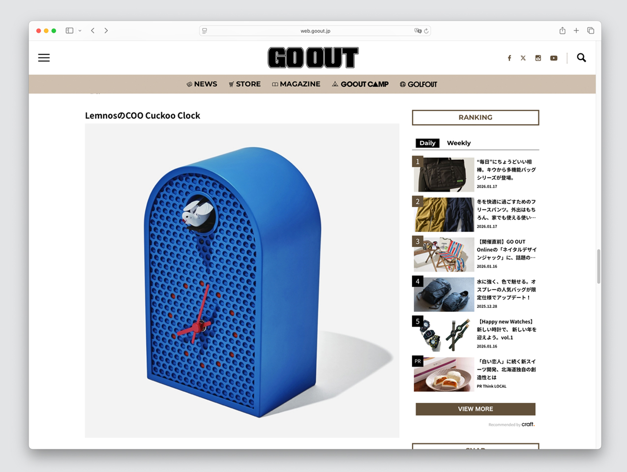 The No.1 outdoor lifestyle web magazine, which distills the essence of the outdoor fashion magazine “GO OUT” and delivers more real and timely information daily, featured the MOMA original color of the cuckoo clock “COO” designed by Ryosuke Fukusada.