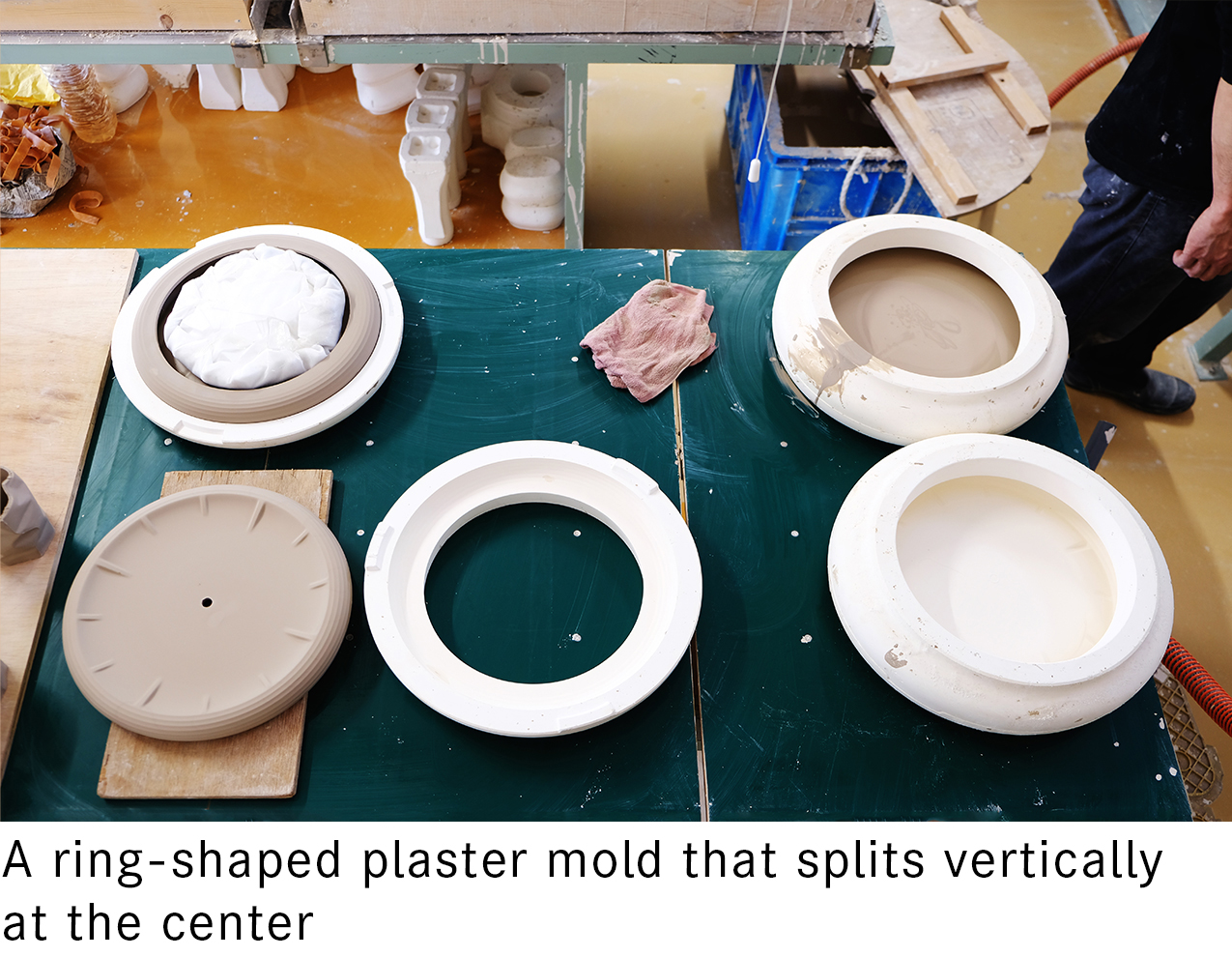 The timing for draining the slip is carefully adjusted according to daily variations in temperature and humidity. When removing the plaster mold, the back is taken off first and left for a period before the front is removed, thus giving the piece time to stabilize. These processes draw directly on the expertise developed through years of hands-on experience.