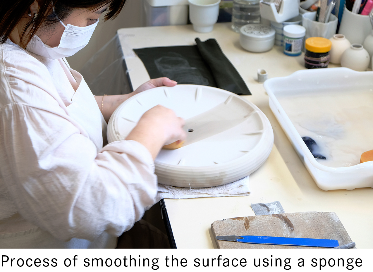 Once the body has dried, any burrs from the mold are carefully trimmed with a knife, and minor surface irregularities from the slip flow are smoothed out using a sponge. After this meticulous work, the piece is ready for firing in the kiln.