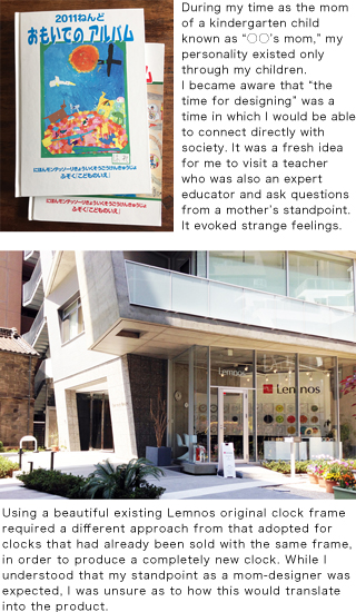 The opportunity to design “a clock which is developed by a mom-designer” with famous clock company Lemnos arose from a short talk with company president Takata. Although I didn’t yet know what direction to take, I promised him I would visit a Montessori nursery school to seek advice. However, there was a big hurdle in my mind.
