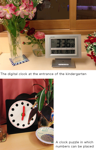 “There’re various materials in the world. Wood and plastic have their beauty respectively. In that sense, both materials are needed and we have various kinds of clocks, analog, digital, big and small, in our kindergarten. The important thing is that the time on the clocks is the same even though each one has a different appearance.”