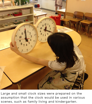 I then took a large carton containing samples of clock frames from Lemnos to my children’s kindergarten. I asked Ms. Misa Sakurai, my children’s kindergarten teacher and a senior researcher of the Japan Montessori Research Institute, about the type of clock that would be suitable for children, in order to seek opinions from a professional educator.