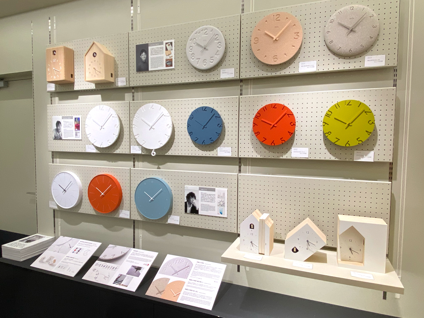 タカタレムノスの時計とそのデザインに関わったデザイナー紹介のほか、カッコー時計を中心としたコーナーと素材コーナー(⾦属・⽊材・磁器・その他)を分けて展示。素材コーナーでは、卓越した⽇本のものづくりを実現するクラフトマン(職人)がつくる手技の仕上げを是非間近でご覧ください。