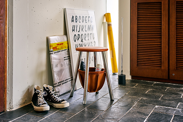 脚が末広がりになっていて安定感があり、切り株に座るようなイメージから「根/KON(コン)」と名付けられました。 KONは、エントランスに最適な小さなスツールですが、プライベートからパブリックまで様々な空間に適しています。脚部はステンレススチール、座面は天然木、レザー、テキスタイルなどの上質な素材を使用し、すっきりとしたフォルムが特徴です。シンプルなベーシックタイプに加え、座面下に革製のバスケットが付帯しているバージョンは、スリッパや靴べらなどの小物を入れておくことができます。周囲の環境に溶け込み、日常使いに最適な家具となります。コンパクトなサイズなので、簡単に移動させることができます。