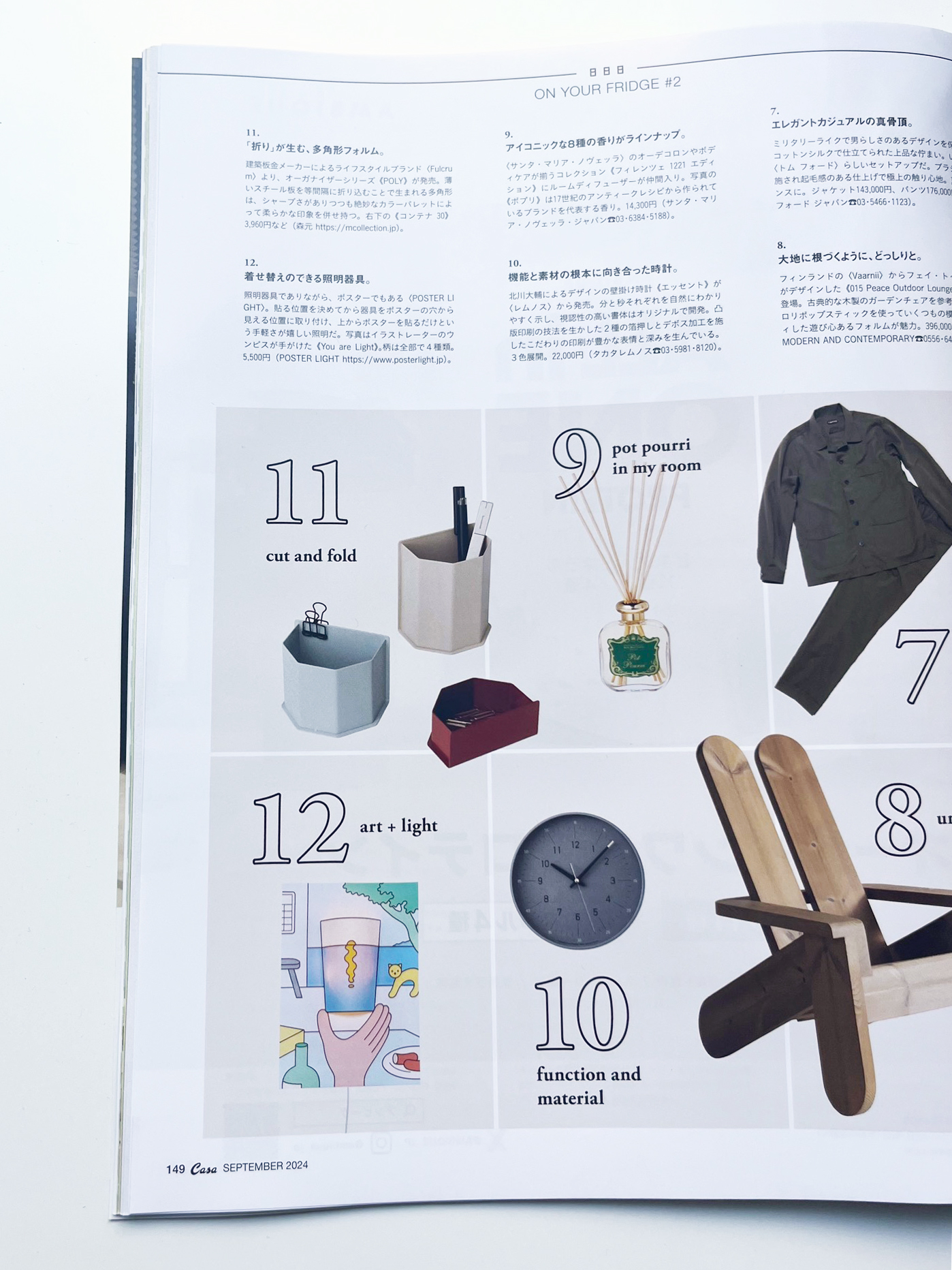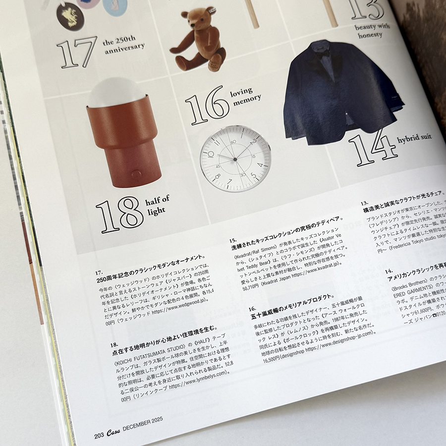 マガジンハウスが発行する『カーサ・ブルータス12月号』の新製品紹介コーナー「ON YOUR FRIDGE #3」にて、五十嵐威暢氏デザインによる掛け時計「earth wall clock less」を紹介していただきました。